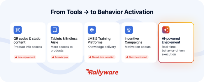 Today’s solutions focus on behavior-driven enablement—delivering personalized, real-time actions and training directly within the associate’s workflow.